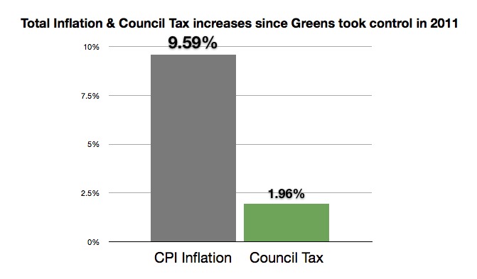Clearly Labour’s tax rises were far above inflation, while ours have been significantly below, even if the 4.75% proposal was to be agreed. And this was during the time of plenty. So in real terms council tax bills have been declining in value under Greens.